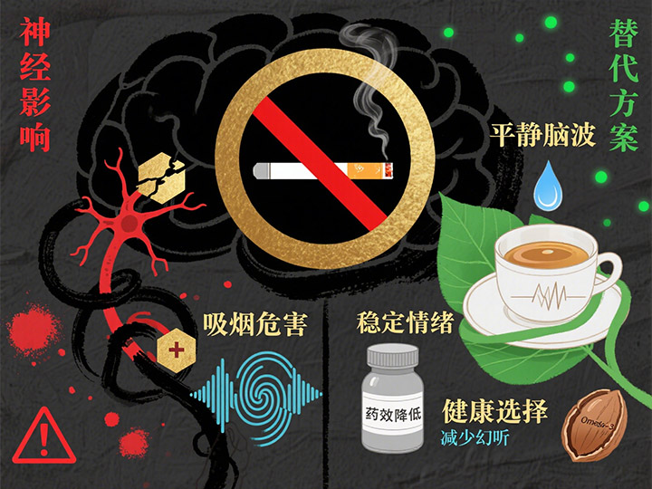 1尼古丁神经刺激作用尼古丁是中枢神经兴奋剂,可能短暂缓解焦虑或压力,但长期使用会加剧神经系统的敏感性,可能加重幻听频率或强度。